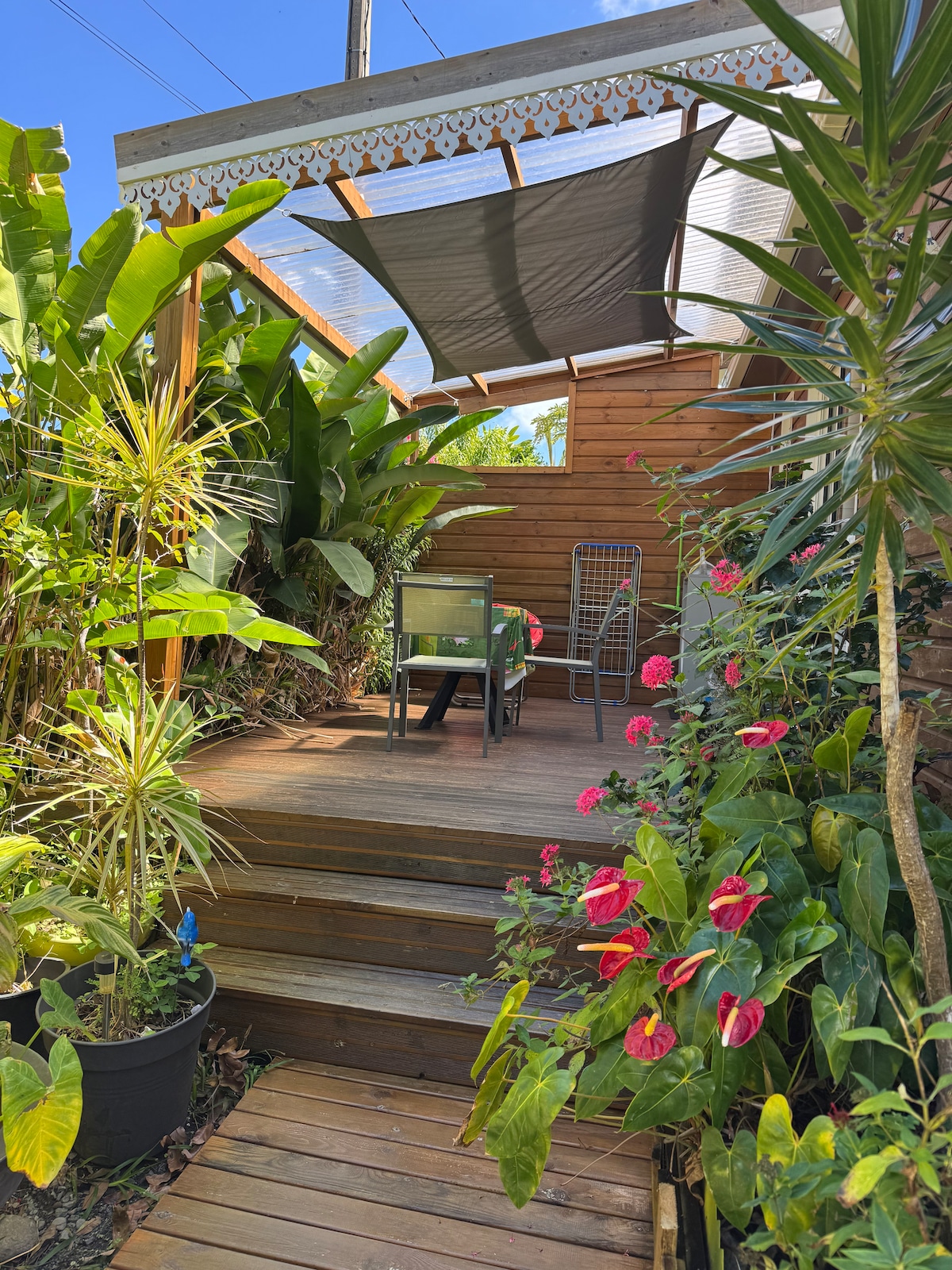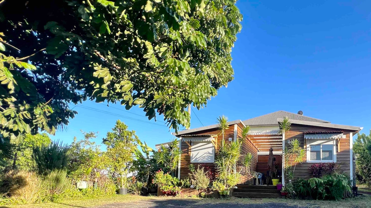Dans un joli jardin créole clos de 1000m2 ( litchis, longanis, avocats, vanille, mangues, Pitaya, coco...) venez vous réveiller avec une magnifique vue sur les montagnes dans un bungalow récent conçu en bois local, avec son entrée indépendante et aménagée avec charme. Vous pourrez aussi vous détendre et vous relaxer toute l'année dans une piscine partagée en pierre naturelle entre 28 et 30°C. À partir de 7 nuits et au delà, une remise est consentie. Alors n’hésitez plus ! ☺️