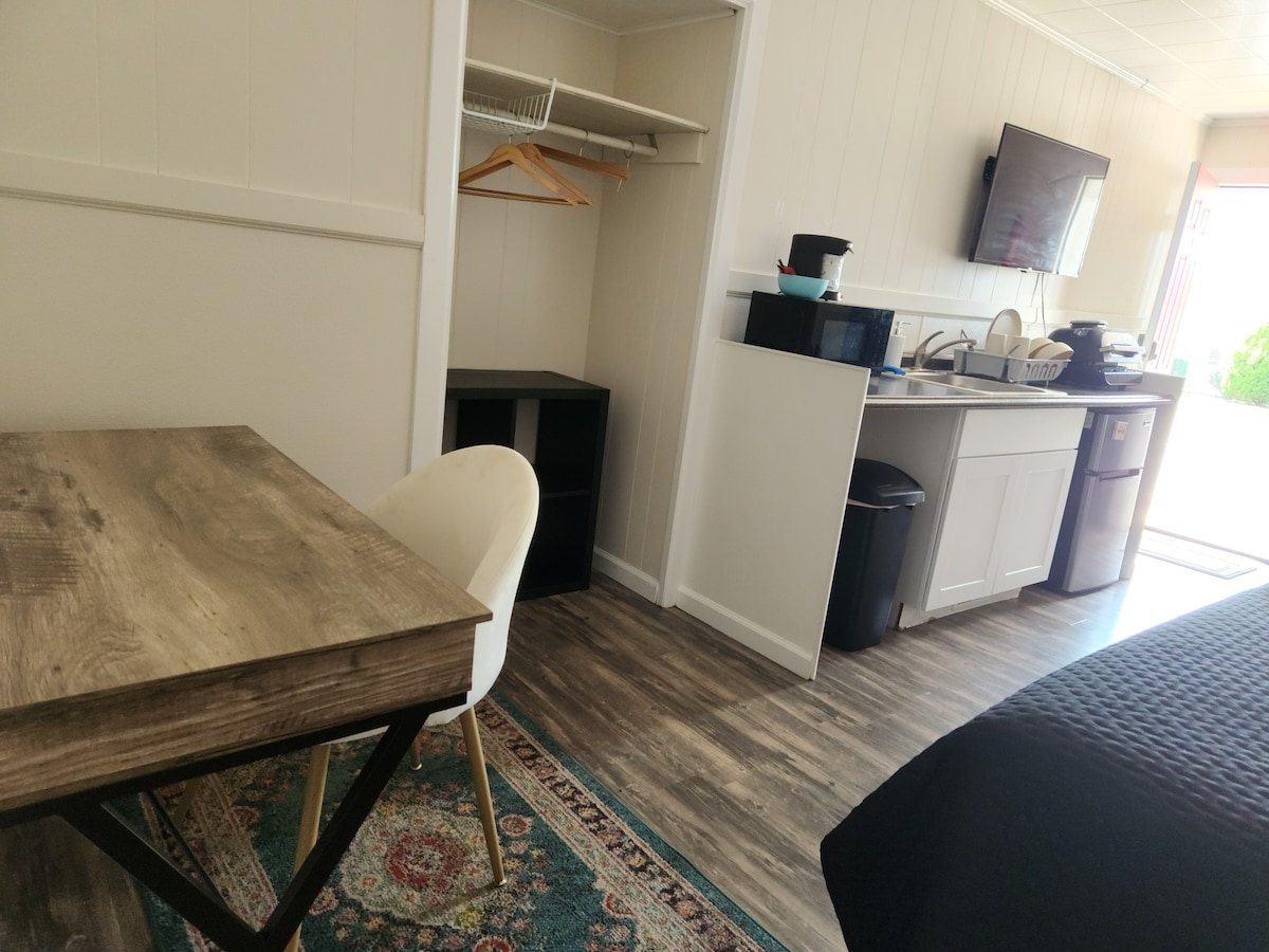 Convenientemente ubicado a 20 minutos de casi cualquier lugar que te gustaría ir en y alrededor de la ciudad. Entrada privada y área de estar. En la habitación encontrarás una cama Murphy con escritorio para un lugar cómodo para trabajar. Cuando llegue el momento de dejarlo por la noche, deja tu trabajo en el escritorio y dóblate para revelar la cama de tamaño completo. El área de la cocina tiene mucho espacio para preparar comidas usando el combo de parrilla de la freidora de aire. La puerta del granero se abre a una gran ducha a ras de suelo. Dobla el asiento del amor para sentarse y ver la televisión.
