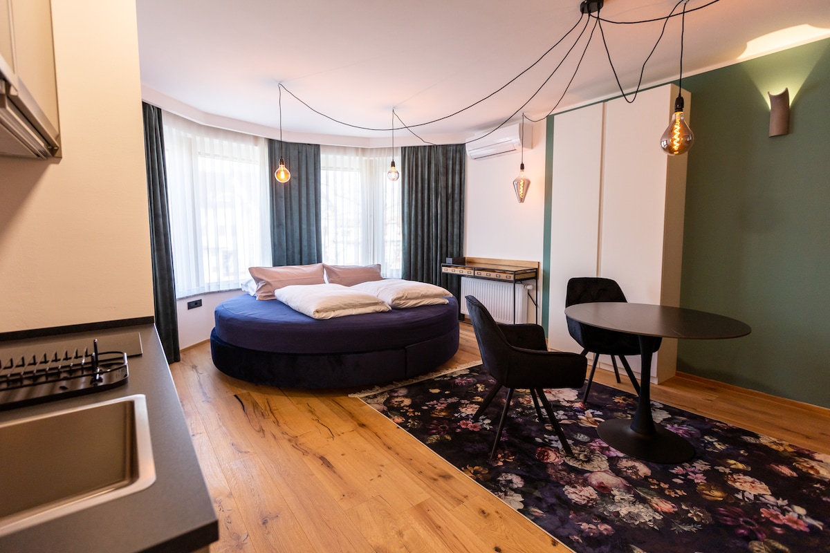 APARTAMENTO FAMILIAR (2 adultos, 2 niños): Gran suite con aire acondicionado brillante seguramente impresionará a todos los viajeros urbanos modernos. Especialmente los amantes del vino se sentirán bien aquí y se sorprenderán en la habitación con un moderno refrigerador con los mejores vinos locales y también los ciclistas, a los que el hotel ofrece una oferta especializada. Las habitaciones cuentan con TV de pantalla plana vía satélite, conexión WiFi gratuita, caja fuerte y baño privado con ducha, secador de pelo y lavabo de piedra de río sobre una base de madera de un antiguo lagar estirio.