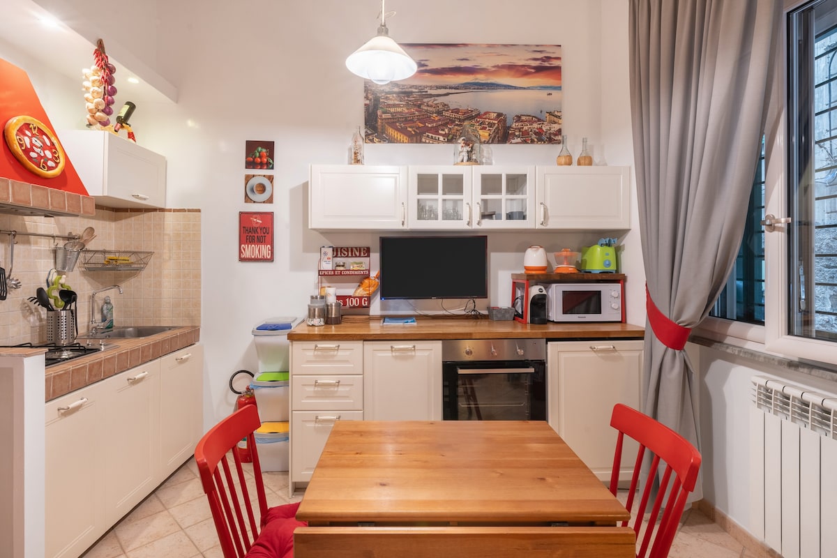 Bilocale ispirato a Pulcinella, storica maschera Napoletana della commedia dell'arte. Arredato con cura, fantasia e originalità, si trova al piano terra del palazzo, situato alle spalle di Piazza del Plebiscito, Teatro San Carlo, Palazzo Reale e Castello del Maschio Angioino. In un caratteristico vicolo Napoletano, nelle immediate vicinanze di Via Toledo, Piazza Trieste e Trento, e il Porto di Napoli. Molti degli elementi di arredo sono simboli scaramantici tipici della tradizione Napoletana.