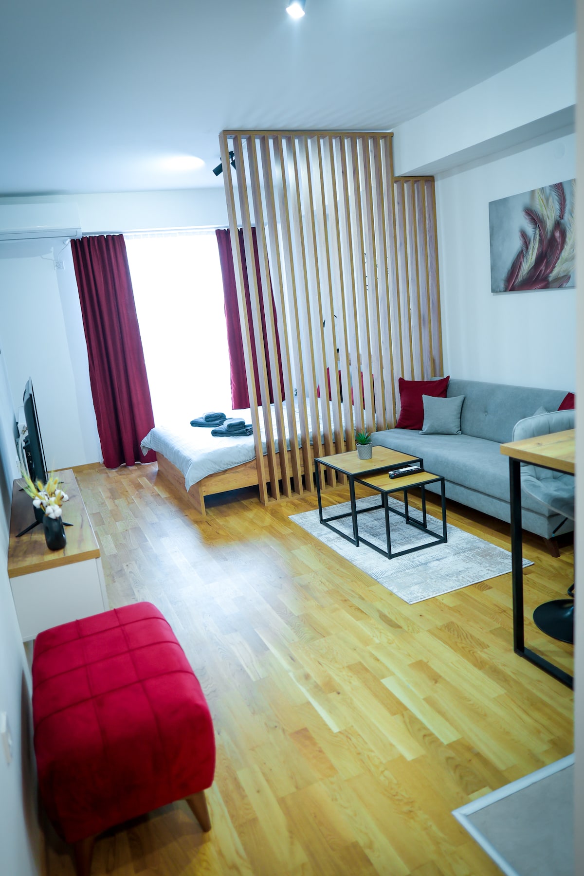 Apartamento nuevo y moderno situado en el centro de la ciudad de Skopje. Tiene capacidad para 4 personas. Hay un sofá en la sala de estar (2 personas) y dos camas separadas en el dormitorio. Hay una cocina totalmente equipada, baño, dormitorio, sala de estar y balcón. La estación internacional de autobuses y la estación de tren se encuentran a poca distancia a pie. La plaza de Macedonia y el antiguo bazar están a 15 minutos a pie. El East Gate Mall y el Vero Mall están a pocos minutos a pie. ¡Disfruta de tu estancia!