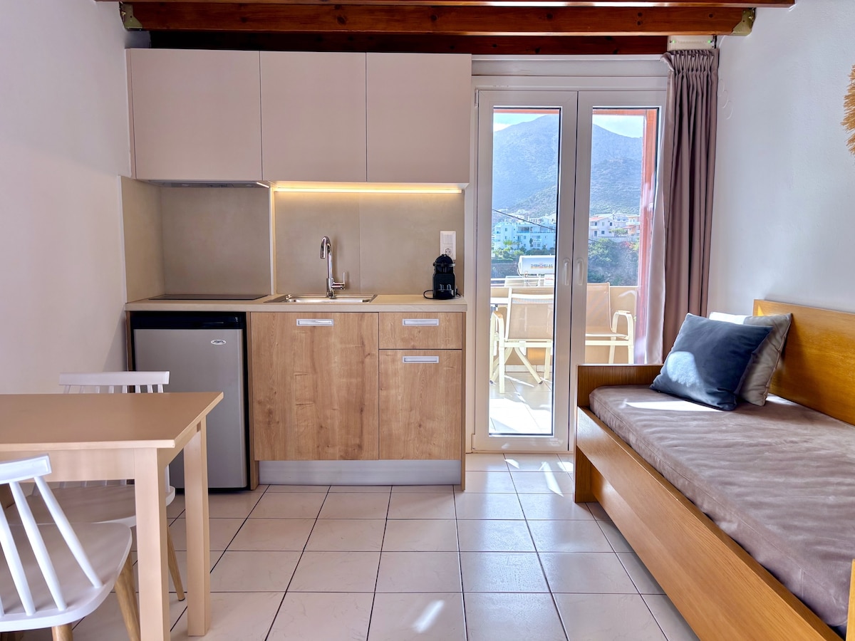 Con vistas al mar de Creta desde su balcón (compartido entre dos apartamentos adyacentes de este tipo), este apartamento de dos niveles cuenta con un dormitorio separado y una cocina pequeña bien equipada con nevera y horno de parrilla de microondas. - Aire acondicionado, TV de pantalla plana (32pulgadas), cafetera Nespresso, caja fuerte y wifi gratuito.