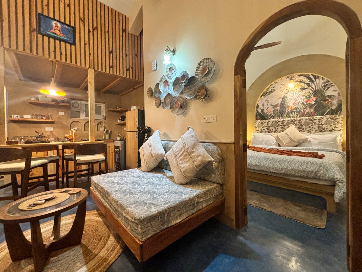 Kanso by Earthen Window es un tranquilo 1BHK en Siolim, diseñado en torno a la tierra, la luz y la privacidad. Diseñados para mañanas lentas y noches sin prisas, los interiores están hechos con paredes encaladas, suaves pisos de microhormigón y objetos cuidadosamente elegidos que le dan un encanto de villa. El dormitorio se abre a una TERRAZA PRIVADA CON JARDÍN y a una bañera de hidromasaje aislada de microhormigón con JACUZZI, ambas con vistas ininterrumpidas al bosque verde. Los servicios compartidos incluyen piscina, baño turco, gimnasio y seguridad 24×7.