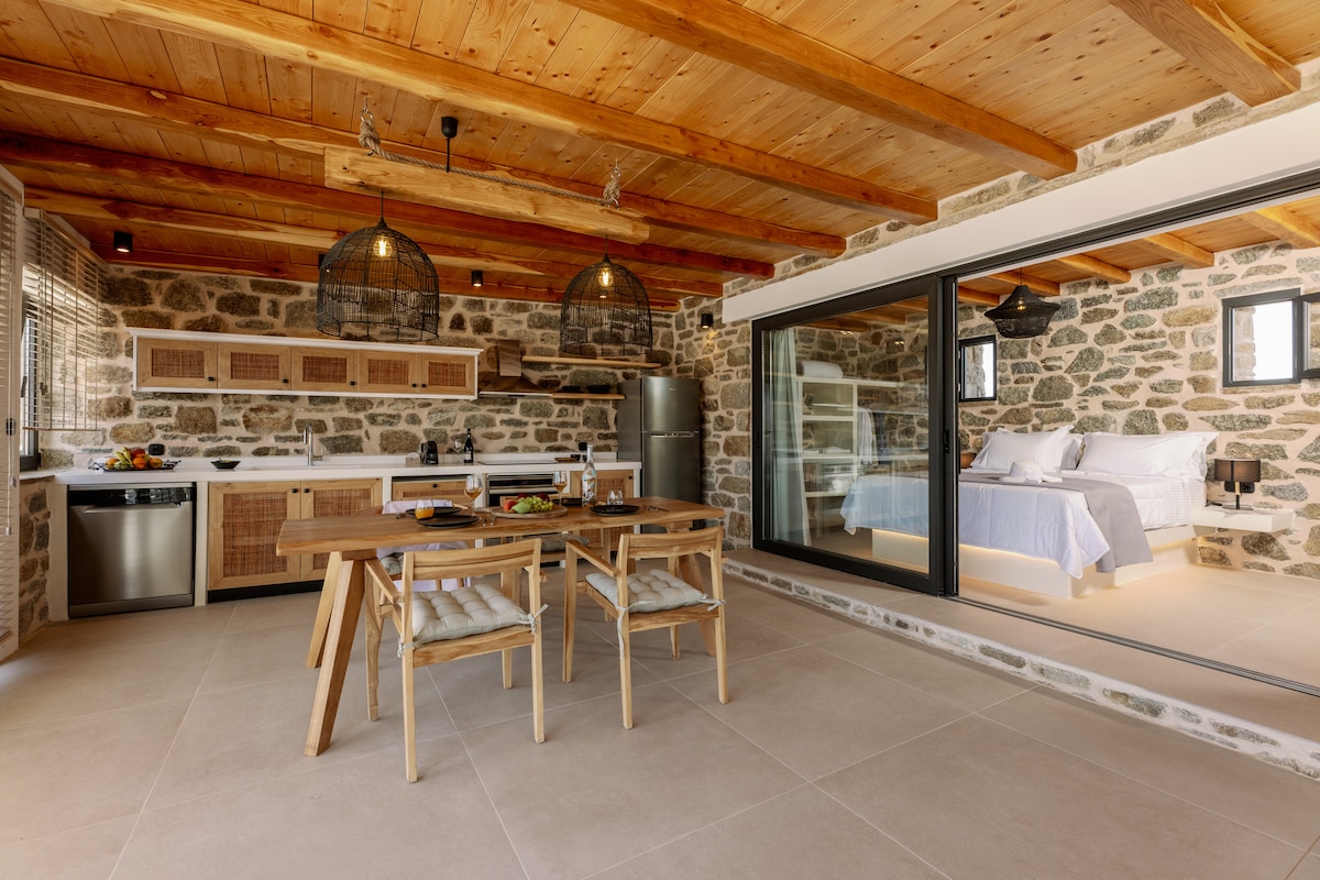 Giacomo Home es una propiedad acogedora en una ubicación impresionante. Construido en estilo tradicional cicládico, cuenta con impresionantes paredes revestidas de piedra y acres de espacio. La simplicidad del diseño arquitectónico y las superficies limpias son un punto central de la composición arquitectónica y la funcionalidad de los espacios. Los dos dormitorios en suite de las casas (Cocomat sleeping eperience) te proporcionan refugios frescos y tranquilos que te ayudarán a calmarte para dormir.