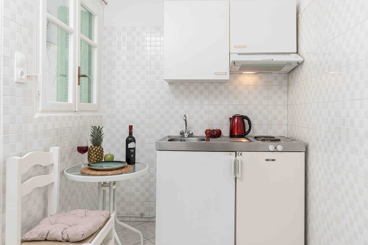 Ático espacioso y espacioso - apartamento (38 metros cuadrados) en el centro de Naxos, a solo 200 metros de la playa de Agios Georgios y a 500 metros del castillo y del puerto donde se encuentran la mayoría de los restaurantes y bares. ¡Tiene una terraza en la azotea con vistas al mar! ¡Paz y relajación para tus escapadas de verano, en el centro de la isla! ¡Te estamos esperando!