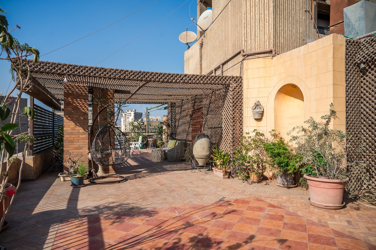 Ven y disfruta de tu estadía en un bonito y acogedor apartamento en la azotea de Mohandessin, Giza. El piso se encuentra en un edificio residencial en Lebanon Square, Mohandessin. ¡El corazón de Giza! La azotea está en el piso 14 y hay 2 ascensores que llegan al piso 13. Así que solo tomarás el piso por las escaleras. El piso 14 tiene solo un apartamento, por lo que esto te da más privacidad.