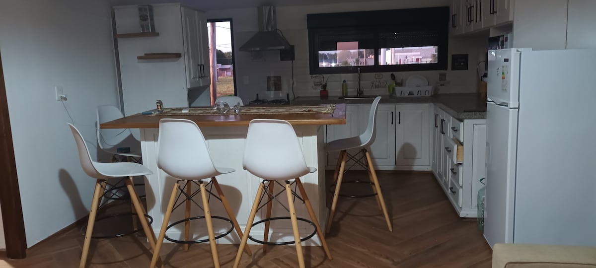 Alojamiento cómodo, práctico y acogedor ubicado a pasos del Puente de Carmelo y a 1km de la Playa Seré. Posee un amplio jardín rodeado de vegetación que lo hacen único. Cuenta con parrillero , horno de barro y fogón. Es un espacio integrado ( loft) con un entrepiso con cama matrimonial y cama de una plaza y baño privado. Posee living comedor amplio con una cama marinera. La cocina muy bien equipada. Ropa de cama y toallas incluídas. Entrada privada y estacionamiento dentro de la vivienda.