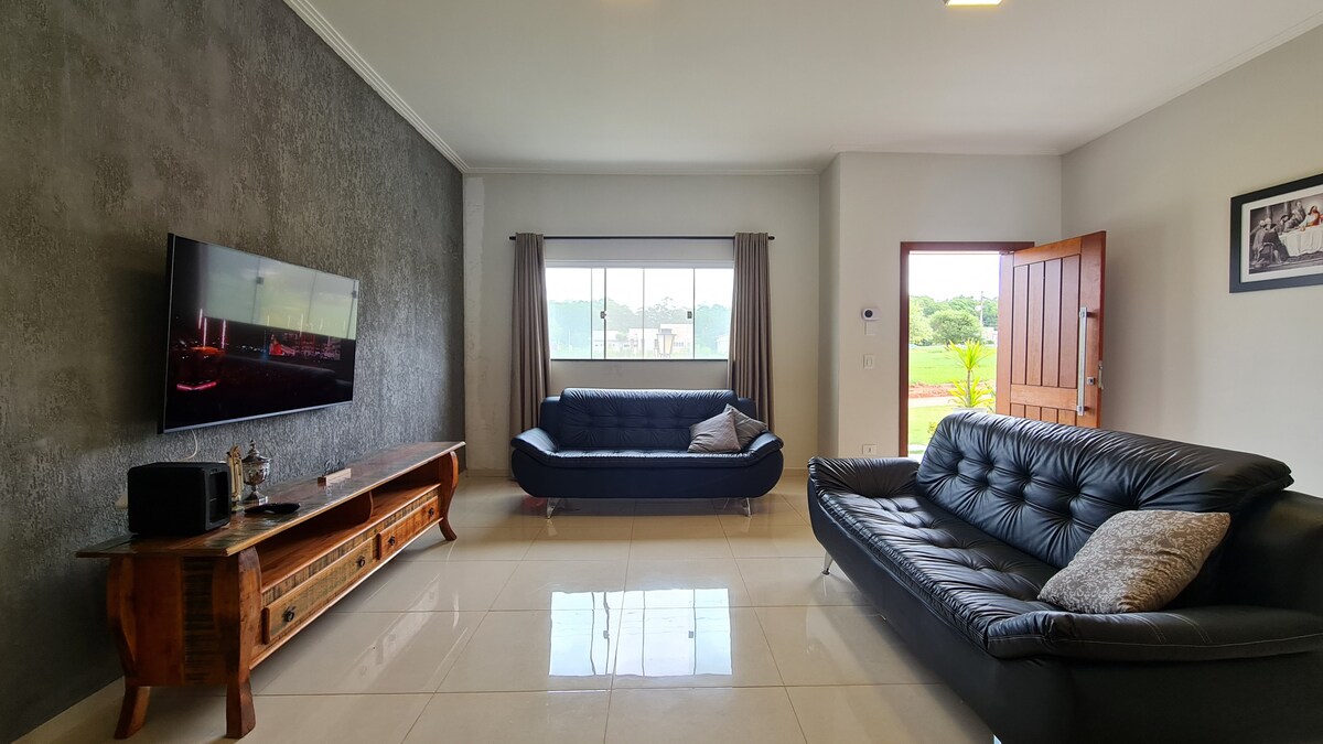 Casa amplia y confortable con 2 dormitorios y 1 suite, con aire acondicionado en la sala y parrilla. Situado en un condominio cerrado que cuenta con varias opciones de ocio, entre ellas bicicleta, pista de carreras, mini golf, sendero a la cascada, con acceso gratuito. Clubes con: piscinas, canchas de tenis, campo de fútbol (acceso por uso diario pago). También encontrarás restaurantes, SPA (acceso pago) y un lago con la posibilidad de alquilar tablas de stand up paddle y kayaks.