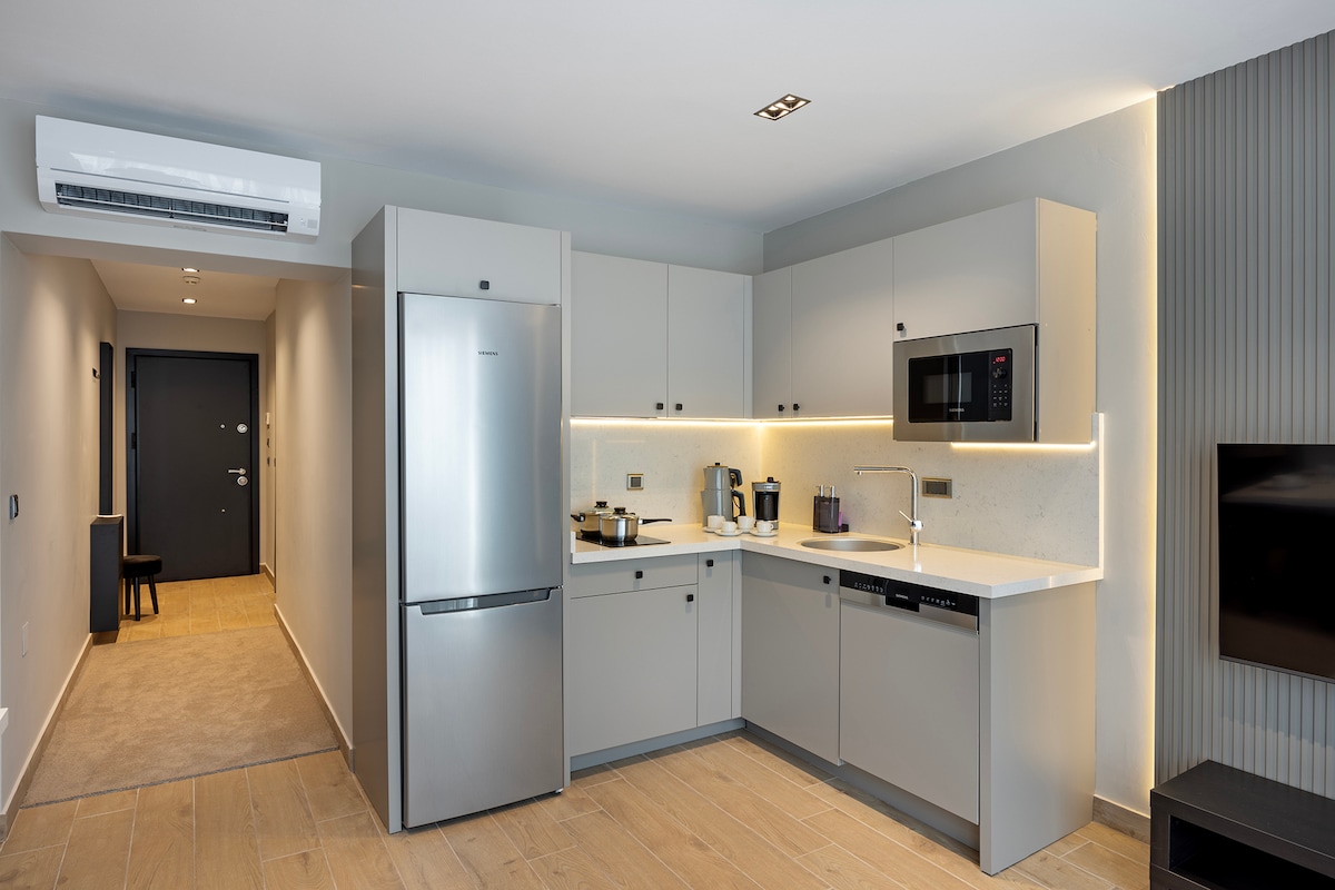 Nuestro apartamento suite, que tiene una vista única donde el Mediterráneo se encuentra con el fascinante azul, te ofrece la comodidad de un hogar con su dormitorio, sala de estar y cocina con mesa de bar. Nuestros apartamentos 1+1 tienen capacidad para 3 personas, con un tamaño de 39-41 m² y ofrecen una simplicidad llamativa con su diseño elegante y moderno, con equipamiento doméstico pensado hasta el más mínimo detalle. Con el agujero para que disfrutes del Mediterráneo y servicios especiales durante tu estancia, donde sentirás la comodidad de Let'stay en cada metro cuadrado.
