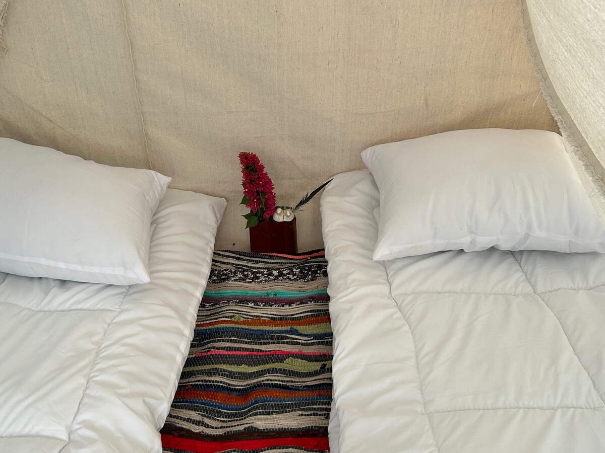 Nuestra cómoda tienda de campaña con cama individual, perfecta para los viajeros que buscan comodidad y aventura. Cuenta con 2 acogedoras camas individuales y electricidad para cargar tus dispositivos, lo que garantiza comodidades modernas. Los huéspedes tienen acceso a baños y duchas compartidos limpios ubicados cerca. Disfruta del sereno entorno de Wadi El Rayan y haz uso de las comidas incluidas a media pensión, con desayuno y cena servidos todos los días. Si estás aquí para relajarte o explorar, esta tienda de campaña ofrece la mezcla perfecta de sencillez y comodidad para una estancia épica.