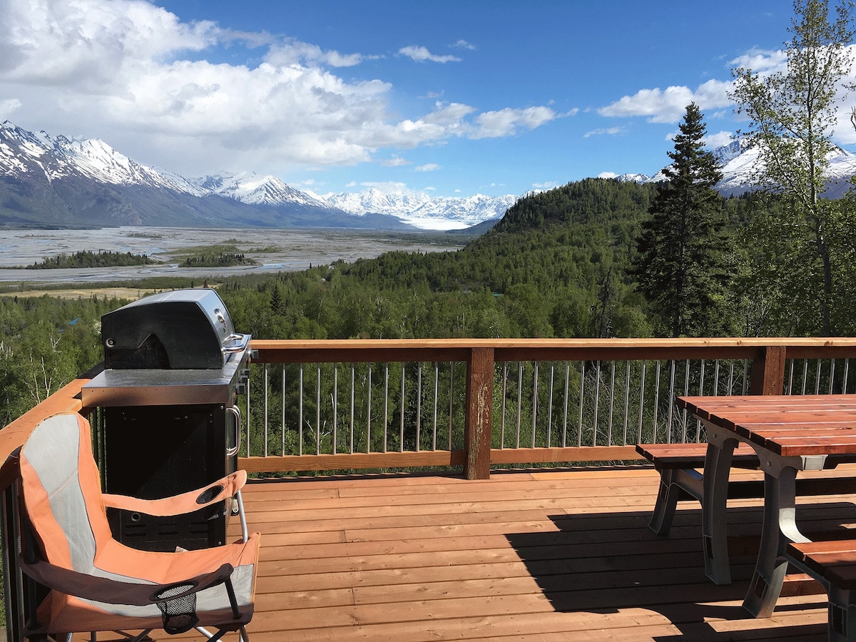 Ron 's Knik Glacier Views es una nueva suite de invitados privada con vistas espectaculares al glaciar Knik y al río. Incluye 120 acres de desierto de Alaska con 3 dormitorios, 1 baño, cocina, sala de estar, capacidad para 6 personas. Los alojamientos incluyen un balcón envolvente. La suite de 1250 pies cuadrados es todo el segundo piso de mi casa. Se accede por su propia escalera y balcón. Una ruta de senderismo de 3 millas te llevará a 5500 pies. La vida silvestre incluye alces, osos y pájaros. A 60 minutos de Anchorage.
