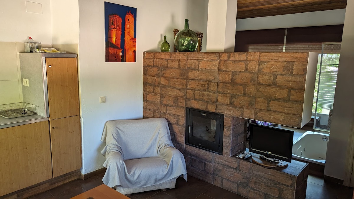 Vivienda tipo loft de un dormitorio en el complejo rural Los Cortijos. Vivienda independiente dotada de bañera de hidromasaje al pie de la cama con excelentes vistas. Chimenea, calefacción, aire acondicionado, salón, zona de cocina y baño