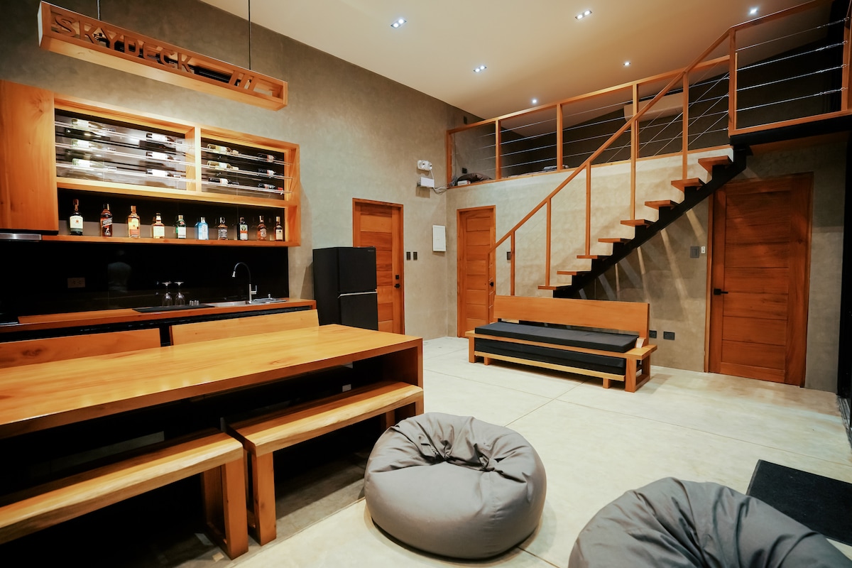 Enjoy a relaxing stay in this cozy tropical A-frame villa just steps from the beach, featuring a charming nipa-style roof, a cool air-conditioned interior, a comfortable loft sleeping area, and a fully equipped kitchen. Unwind on the private patio or dine outdoors surrounded by lush greenery, with easy beach access making it the perfect spot for a laid-back island/farm-ranch getaway.