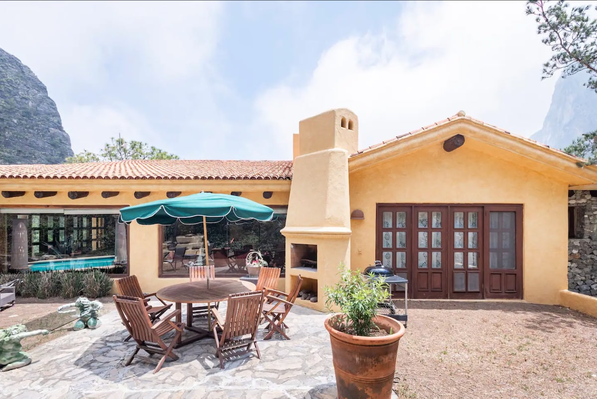 Esta propiedad está equipada con dos recámaras, cocina y WIFI. La casa tiene dos baños completos con agua caliente. Nuestra propiedad está muy bien ubicada, es muy espaciosa y tiene todo lo que necesitas. La vista desde el porche es maravillosa. Se puede ir caminando hacia el Potrero Chico pues la distancia es corta. Este es el lugar perfecto para quedarse, si lo que buscas es un lugar privado y discreto. Podemos hospedar hasta 6 personas con un cargo extra. Proveemos catre para c/persona extra.