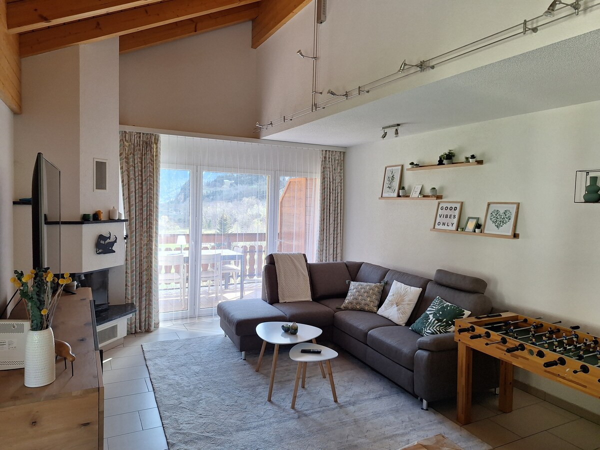 Estudio ático con terraza de 100 m2, vistas ininterrumpidas a los Alpes y bañera de hidromasaje PRIVADA. Espacio interior compuesto por una sala de estar y comedor abiertos con una cama plegable Murphy (180 cm), TV de pantalla grande, baño completo y una acogedora oficina. y en la cocina había de todo. En el exterior, la terraza y las vistas te esperan. Una mesa de comedor al aire libre, una hamaca y un brasero te invitan a relajarte. Acceso cercano a los teleféricos Gemmi y Torrant y a los baños termales.
