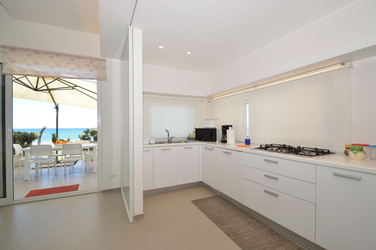 Elegante villa junto al mar, amueblada con buen gusto y elegancia, ideal para unas relajantes vacaciones. Consta de 4 dormitorios, dos dobles y dos dobles, dos baños, una gran cocina-comedor de espacio abierto y dos terrazas cubiertas, una en la playa y la otra a pocos pasos del mar. Tiene un jardín a la sombra de árboles, equipado con área de conversación y comedor con barbacoa, ducha y mampara al aire libre con calefacción y estacionamiento privado.