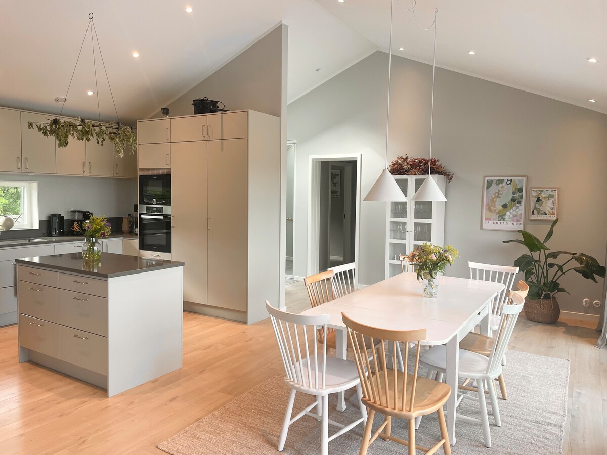 Departamento de invitados de nueva construcción con loft para dormir de unos 40 metros cuadrados. Atardecer con sol después del almuerzo. Aire acondicionado. A unos 330 metros del lago y la posibilidad de nadar desde el embarcadero. Y a unos 500 metros de la zona de piscina con playa y torre de buceo. En el centro, existe la posibilidad de alquilar un kayak o una tabla de surf de remo. Estacionamiento gratuito y CONEXIÓN WI-FI. Cama de 160 cm en loft y sofá cama de 140 cm en la sala de estar. Televisión inteligente de 65 pulgadas con Chromecast, Apple TV y Playstation 4. No hay una altura total de pie en el loft. A unos 15 minutos a pie de la estación de tren de Floda.