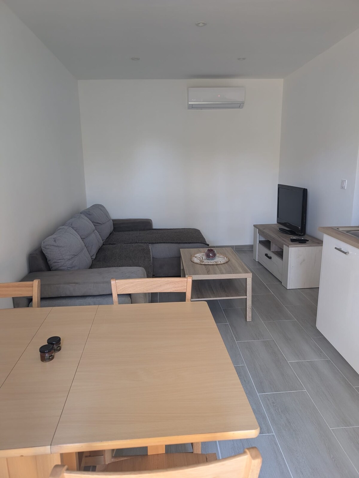 Agréable logement neuf d'environ 30 m2 en rez de villa. Situé dans une résidence calme,le logement est composé d'une climatisation, du wifi, d'une machine à laver, d'un four convertible, d'un réfrigérateur congélateur, d'une douche mais aussi d'un espace nuit avec un lit en 140x190 cm. Le salon est équipé d'un canapé convertible. Le logement peut accueillir 4 personnes. Possibilité de mettre à disposition une chaise haute. Terrasse privative d'environ 15m2. JUILLET ET AOÛT 3 NUITS MINIMUM