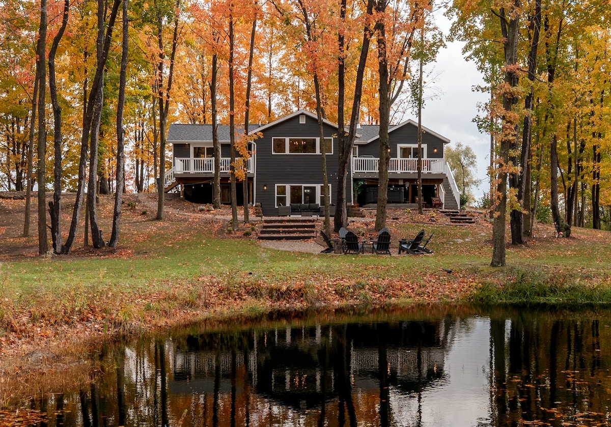 Relájate en esta impresionante casa moderna en un hermoso entorno boscoso. La casa está bañada por la luz del día y se ven árboles majestuosos. Relájate en la acogedora chimenea interior/exterior y diviértete en el patio trasero con una barbacoa, jacuzzi y fogata en el patio trasero. 3 dormitorios y 2 baños y medio y una cocina bien surtida. Amplia sala de juegos en garaje climatizado. Escápate a esta experiencia vacacional única a pocos minutos de Saugatuck, las playas del lago Michigan y la región vinícola de Fenn Valley. Se admiten perros.