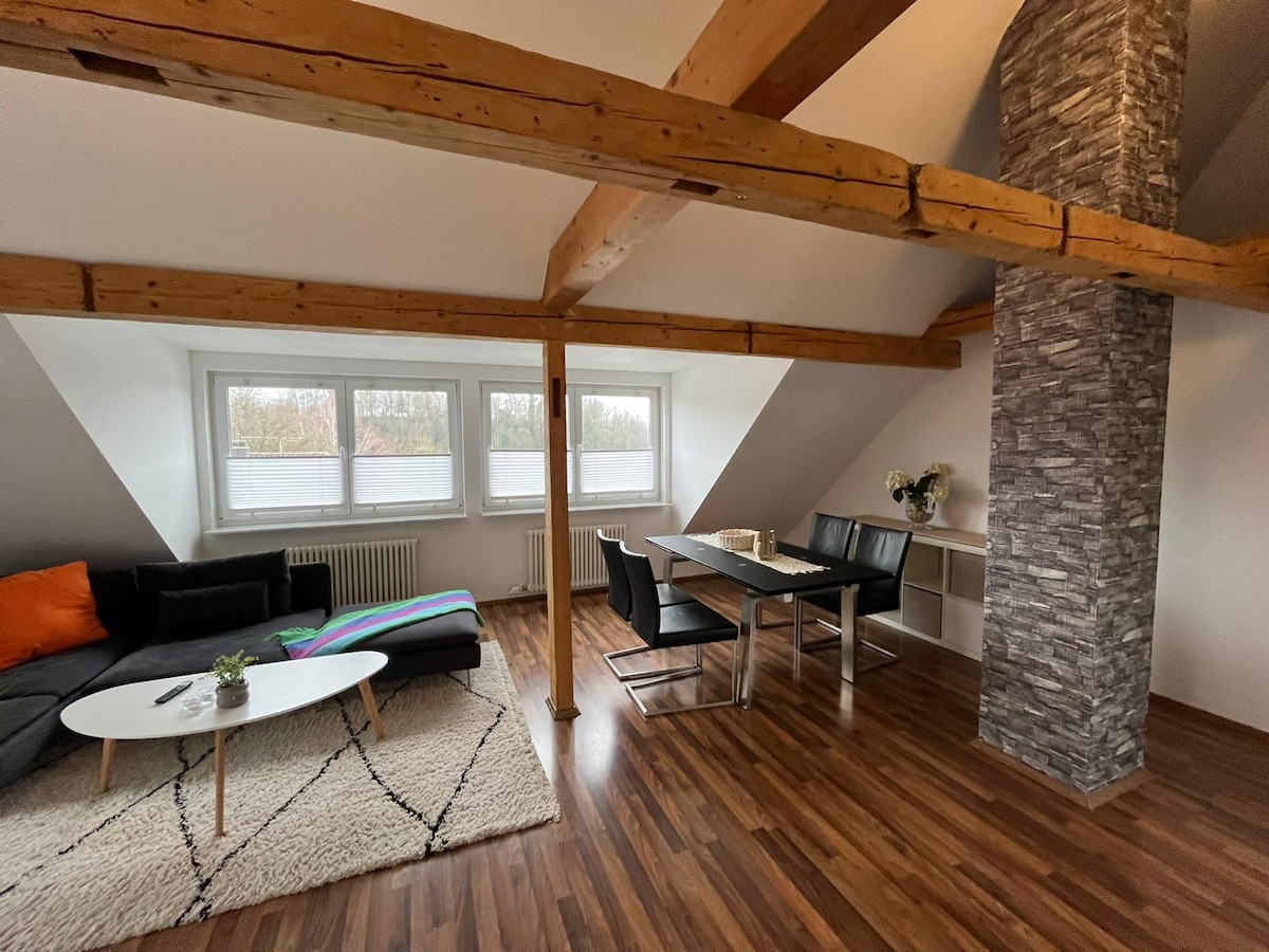 Nuestro alojamiento es un ático grande y bien equipado. Además de un acogedor dormitorio, hay una sala de estar y comedor con un sofá cama para 2 personas, un rincón de lectura, un baño moderno y una cocina. Desde el dormitorio se tiene una gran vista del castillo de Altshausen. La ubicación es céntrica (div. tiendas, panaderías y restaurantes a 5 minutos a pie) y, sin embargo, tranquila. El jardín puede ser compartido. Un hermoso lago se encuentra a 10 minutos a pie.