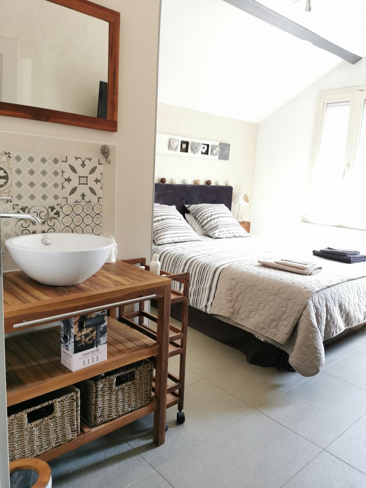 El alojamiento, en el piso de arriba de una casa, consta de dos habitaciones de 15 m² (camas dobles) con baño y aseo privado. Disponible en el mismo nivel, un altillo equipado: cocina, sofá no convertible, mesa, 2 frigoríficos, microondas, mini horno clásico, dos cafeteras (una de filtro, la otra de cápsulas Nespresso, Dolce Gusto o Senséo), hervidor de agua.