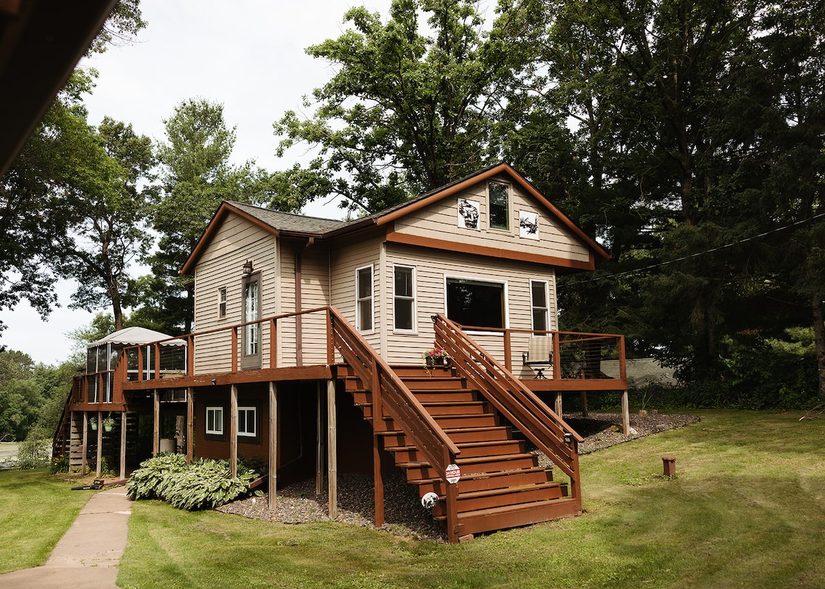 Nueva casa de 520 pies cuadrados 'no demasiado pequeña' en 20 acres de tierra salvaje. Diversión todo el año. Se admiten perros. Enchufe para autocaravanas y vehículos eléctricos. Fogata. Tus senderos de Snowshoe Creek y Little Wood Lake. Canoa, kayak y barca de pedales gratis. Barco mini-pontón 40 USD/día. Pesca. Internet. Wifi. Aire acondicionado. Chimenea de gas. Duerme por número. Baño encantador. Cocina de gas nueva. Máquina de hielo. 2 televisores. 3 ciudades + Burnett Dairy/Bistro, 4 campos de golf, DQ para comer bien, minigolf, antigüedades, multiteatro, playa Siren y «Music in Park». ¡Vida silvestre! Volverás.