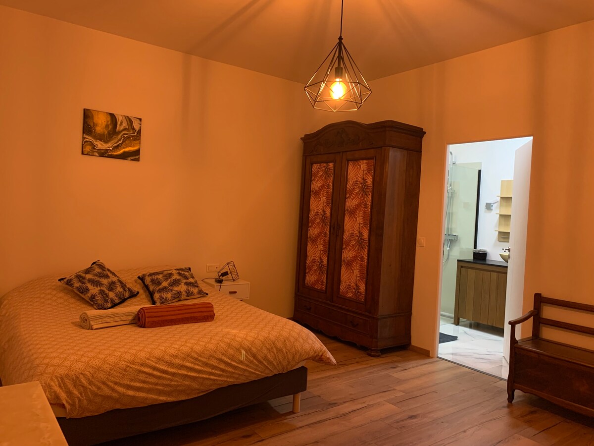 Habitación de 35 m² con todas las comodidades en el primer piso, para 1 o 2 personas + desayunos en una casa burguesa con un jardín paisajístico, amueblada con una cama XXL 160x200 con controles eléctricos, TV de pantalla plana, cómoda, vestidor + cuna, bandeja de bienvenida (cafetera + hervidor), - pequeña sala de estar: 1 escritorio, 2 sillas, 1 mesa de centro y 2 sillones, - Cuarto de baño con lavabo + secador de pelo + ducha italiana. Los inodoros son independientes. Gimnasio disponible. A 45 minutos de la bahía de Somme.