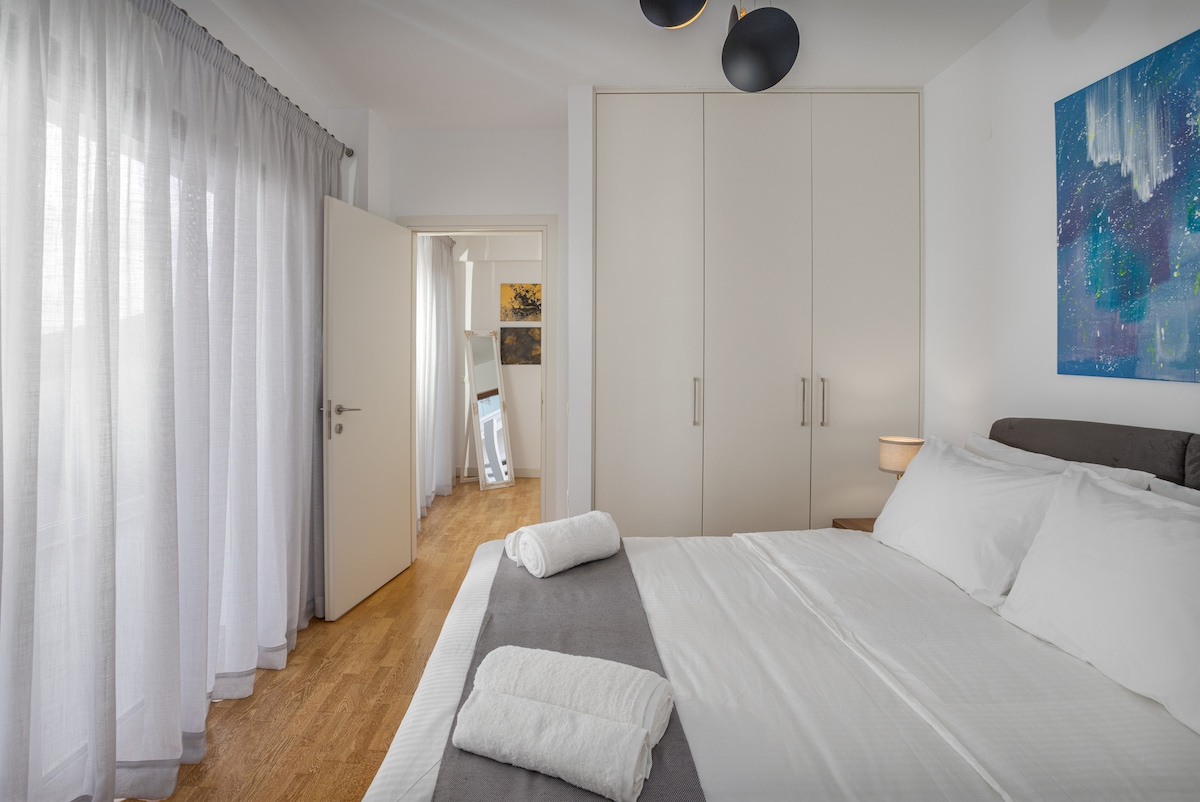 Disfruta de tu estadía en un apartamento de lujo y elegante junto al mar. Se te proporcionarán instalaciones amplias, totalmente amuebladas y equipadas y comodidades actualizadas, que incluyen cocina, sala de estar, comedor, dos dormitorios, baño y un gran balcón con una fantástica vista al mar. Hay un espacio de estacionamiento privado disponible. El mar está bajo tus pies, a 15 metros de la casa. Puede alojar hasta hasta 6 personas cómodamente.