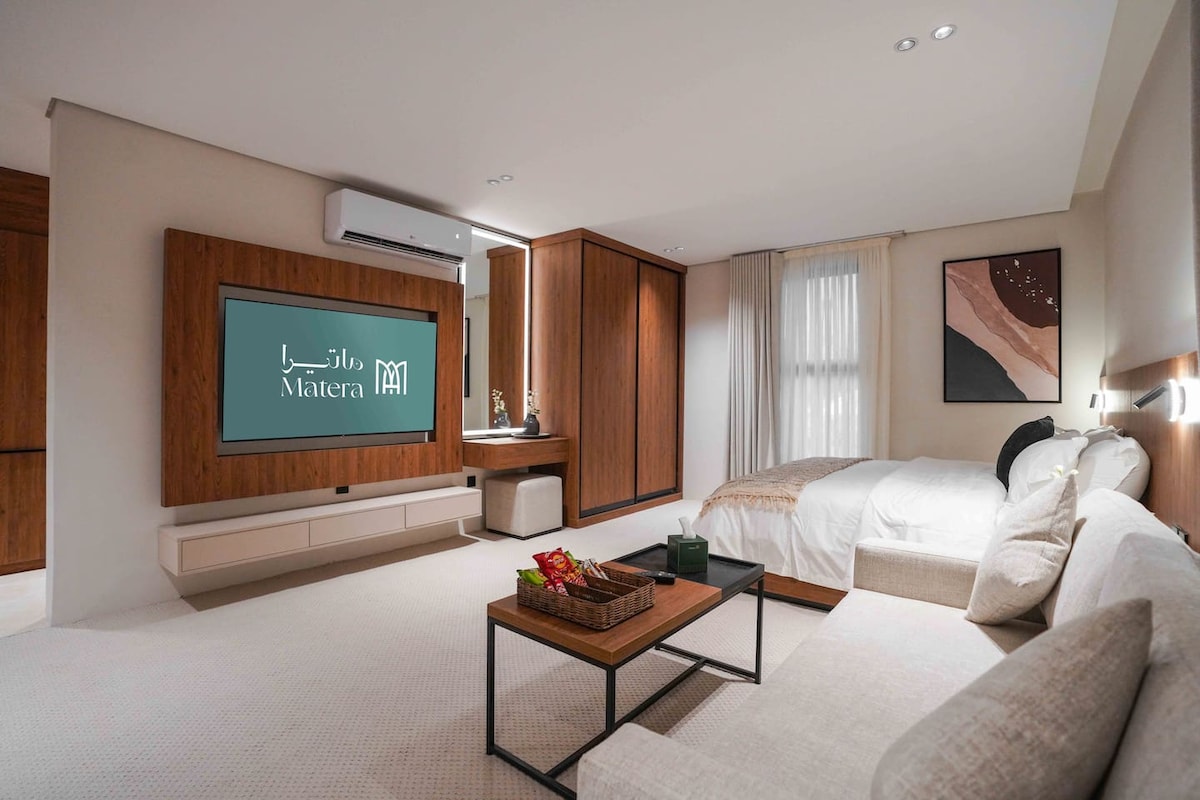 Moderno estudio hotelero con una amplia zona en un barrio tranquilo. Autorregistro de entrada + wifi + colchón médico + cómodo sofá de alta calidad + rincón de café + servicios de hotel + cocina totalmente equipada. • Ubicación céntrica privilegiada, a 1 km de la carretera de circunvalación norte: • Aeropuerto: 12 min • Distrito financiero: 15 min • Riyadh Park, Nakheel y Granada Mall: 10–20 min • Riyadh Season & Boulevard: 15-20 min • Imam, Princess Noura y e-University: 10-15 min ⚠️ Limpieza diaria al estilo hotelero a la hora que prefieran los huéspedes.