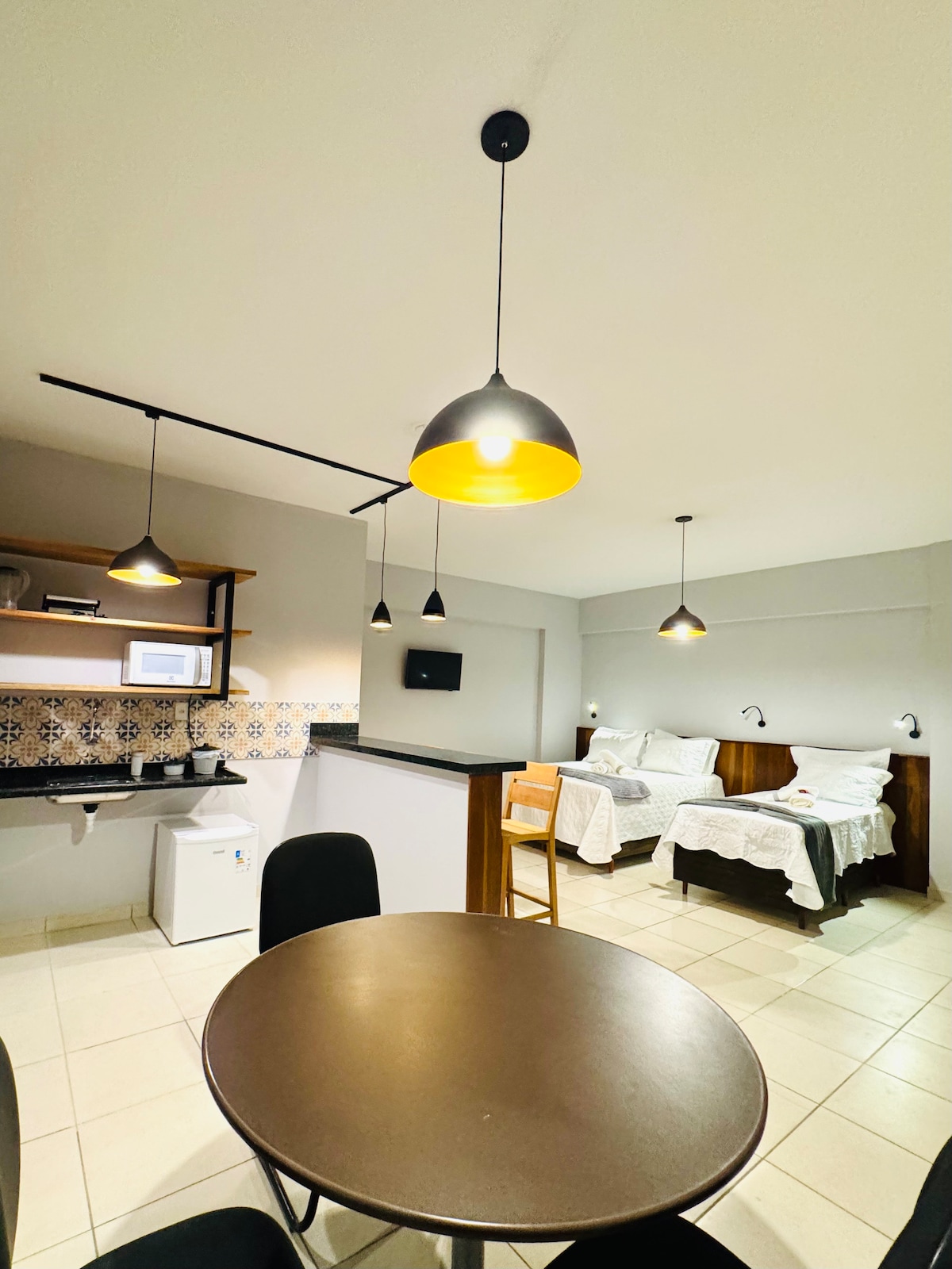 Suíte ampla, nova e moderna, oferece conforto e segurança. Equipada com cama queen, sofá que acomoda mais uma pessoa, ar condicionado, TV Smart, Wi-Fi, cozinha com frigobar, microondas, cafeteira, chaleira, pratos e demais ítens para preparo de lanches, pequenas refeições, ou saborear um bom vinho. Localizado no centro de Vitória da Conquista, conta, ainda, com garagem fechada.Edifício com câmeras e fechadura digital. Elegante e estiloso.
