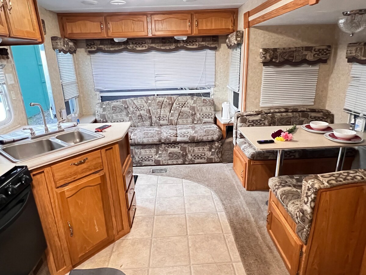 Camper pequeño y divertido para llegar a tu propio espacio. Cama tamaño grande, baño grande, baño con ducha. Cocina con microondas de horno, nevera un pequeño hogar lejos de casa.