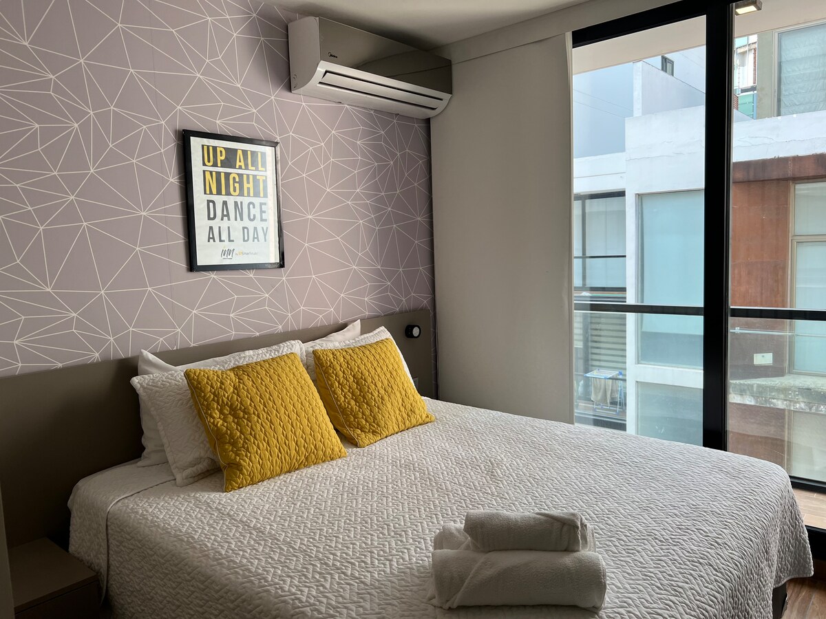 Descubre la elegancia en este acogedor departamento de 1 habitación con vistas de ensueño. Experimenta el lujo de un equipamiento extremo con una Smart Tv de 65" 4K HDR en sala y otra Tv 50" en dormitorio, potentes equipos de aire acondicionado, lavadora, y electrodomésticos necesarios, cama Queen Ultra Confort, cambiador y tocador, además de la domótica y Alexa para cumplir tus ordenes. Viví la síntesis de la modernidad como nunca antes, reserva YA!