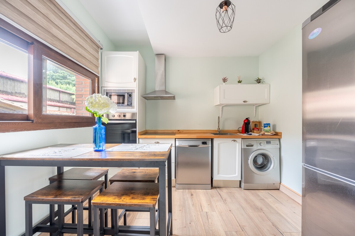 Vivienda de 75 m2 útiles distribuidos en tres niveles y que cuenta con cocina independiente, distribuidor-comedor, salón con chimenea y dos dormitorios con baño incorporado. Se trata de un edificio antiguo totalmente renovado y equipado con cocina vitrocerámica, horno, microondas, lavadora, lavavajillas, frigorífico, pequeños electrodomésticos, vajilla y ropa de cama y baño. Tiene un patio cerrado con acceso desde la cocina para relajarse o comer en el exterior y un balcón sobre la calle.