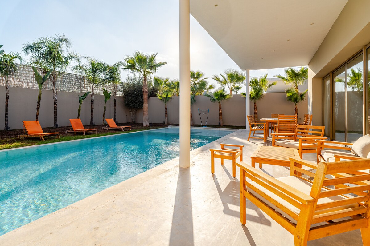 Disfruta de una estancia en esta lujosa villa en el barrio más famoso de Marrakech, ubicada en Amelkis Golf Resort, a 12 minutos del centro de la ciudad de Marrakech. La villa ofrece amplios espacios de estar totalmente rodeados por grandes puertas de patio en todas las habitaciones y espacios de estar que dan a una gran piscina y un hermoso jardín exótico. El diseño de la villa se ha realizado con materiales orgánicos locales mezclados con la modernidad de hoy. El interior y el exterior se unen de una manera única.