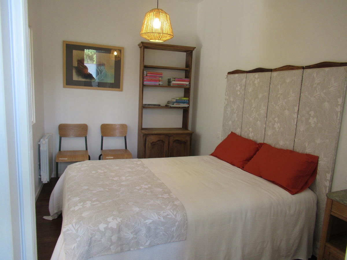 Casa de una planta con vistas a dos jardines. El del sur es privado. El más grande al norte se comparte con nosotros... cuando tenemos niños pequeños. Cada habitación tiene un baño y un aseo. Un lugar acogedor para disfrutar de la tranquilidad junto a la estufa en invierno. Cómodamente equipada para la cocina. A los niños les encantarán los burritos, el columpio y la cama elástica del jardín.