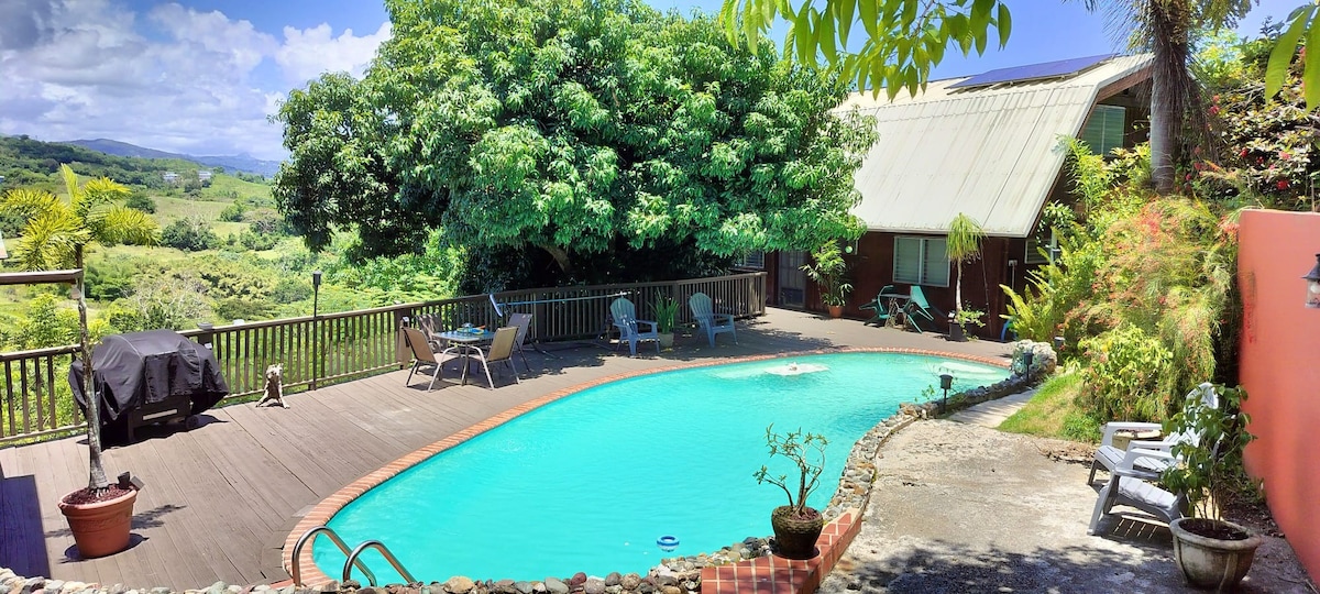 VILLA TRANQUILIDAD Casa estilo chalet canadiense de dos niveles en madera de cedro con piscina privada y terrazas al aire libre con vista panorámica a la campiña y lomas de San Germán, ciudad fundada en 1511. Es idóneo para amantes de la naturaleza. Precios estan basados en $79 por persona por noche. No esta permitido fiestas ni eventos.