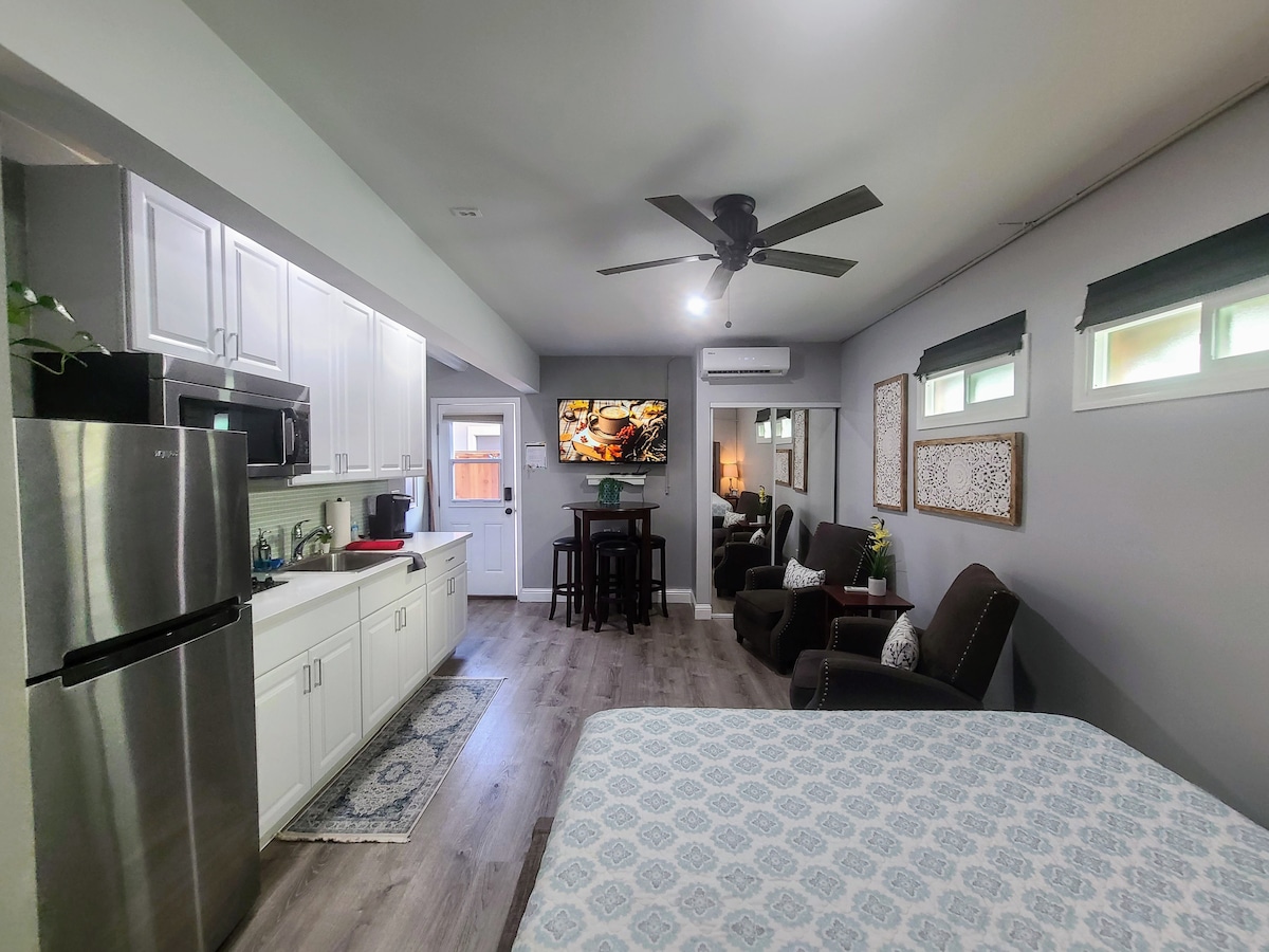 Este espacio es un pequeño estudio de entrada privada de 275 pies cuadrados con baño privado, conectado a la casa principal, pero sin acceso a la casa principal. La unidad tiene una mininevera de tamaño estándar, microondas y cafetera keurig con cafés para elegir, un horno muy mini tostador para un bagel o un trozo de tostada, aperitivos ligeros y agua para ti. También hay un pequeño conjunto de mesa y silla, escritorio y una cama tamaño queen completamente nueva. La ubicación es excelente si trabajas en el laboratorio o si visitas a familiares en la zona.