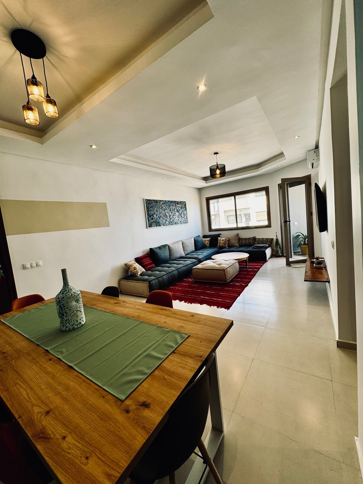 Vivez la simplicité et la commodité dans notre appartement proche des plages. Cet appartement neuf, spacieux et lumineux de deux chambres et séjour 74m présente un design moderne et minimaliste, vous assurant de profiter au max de votre séjour. Situé dans un quartier calme, au sein d'une résidence sécurisée de moyen standing, il se trouve à seulement 5 minutes de la Marina d'Agadir et à 10 minutes de Taghazout. La plage la plus proche est à seulement 400 mètres, accessible à pied ou en voiture.