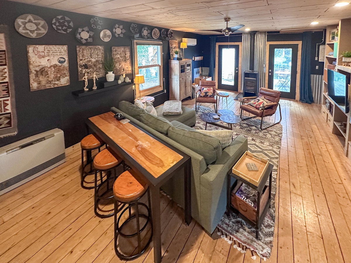 Taller de carpintería reconvertido, pasó un tiempo como ebanistería, tienda de marcos de fotos y, más recientemente, loft de artista. ¡Piensa en un loft neoyorquino que se encuentra con una cabaña de montaña, con estufa de leña con puerta de cristal! Ahora, es un espacio único. Entra por el amplio garaje para 2 coches hasta la tienda original, diseño actualizado para una escapada única al LOFT de montaña. Piensa... ¡rústico, crudo, real, de vuelta a lo básico, con un toque moderno! ¡Calefacción/aire acondicionado mini-split de 2 zonas! Calienta bien hasta alrededor de 30 grados, calentador de pared en el baño/calentador de gas en la sala de estar.