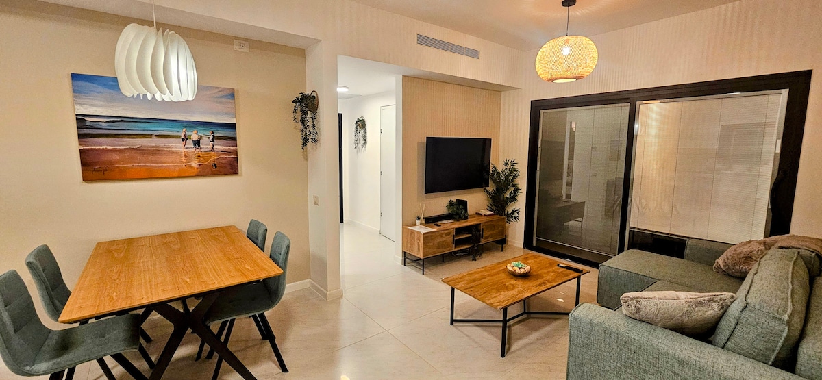 ⚠️Only Hosting Families⚠️ Step into Eilat Prestige, where brand-new luxury meets the ultimate location. Perfectly positioned next to the vibrant Terminal Park, our apartment offers a sophisticated urban oasis just a short, scenic walk from the boardwalk (Tayalet), Ice Mall, and the Red Sea beaches. Designed for families or couples who refuse to compromise on comfort. With two spacious bedrooms and two full bathrooms, everyone gets their own space to relax and refresh after a day in the sun.