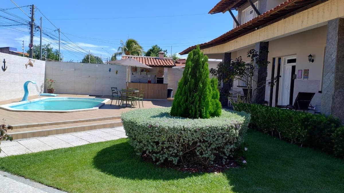 La casa ofrece todo lo que necesitas para una estancia cómoda. Situado a 2,5 km de la playa. Es ideal para familias, parejas, viajes de negocios y turistas que quieran conocer la ciudad. La propiedad tiene: - Una piscina privada; - Área de juegos con mesa de billar y juegos; - Zona de barbacoa gourmet. -Garaje para 2 autos; -3 suites con ventiladores de techo (2 suites con aire acondicionado); - Ducha eléctrica en todos los baños; - Perrera completa.