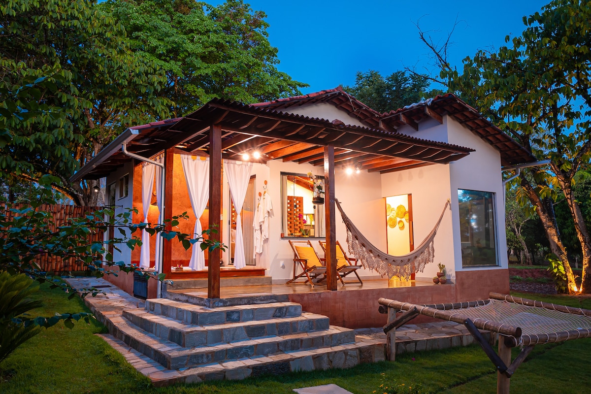 SIGA-NOS NO |NSTAGRAM @ENCANTOCERRADO Um refúgio moderno para casais no coração da natureza do cerrado. Com design contemporâneo e toques rústicos, a cabana oferece vistas panorâmicas, amanheceres e noites estreladas. Completa com uma cozinha totalmente equipada e sala de estar com hidromassagem. A varanda privativa inclui fogueira e piscina aquecida para momentos românticos. Uma oportunidade única de fugir da rotina, criar memórias e celebrar o amor em meio à natureza exuberante do cerrado.
