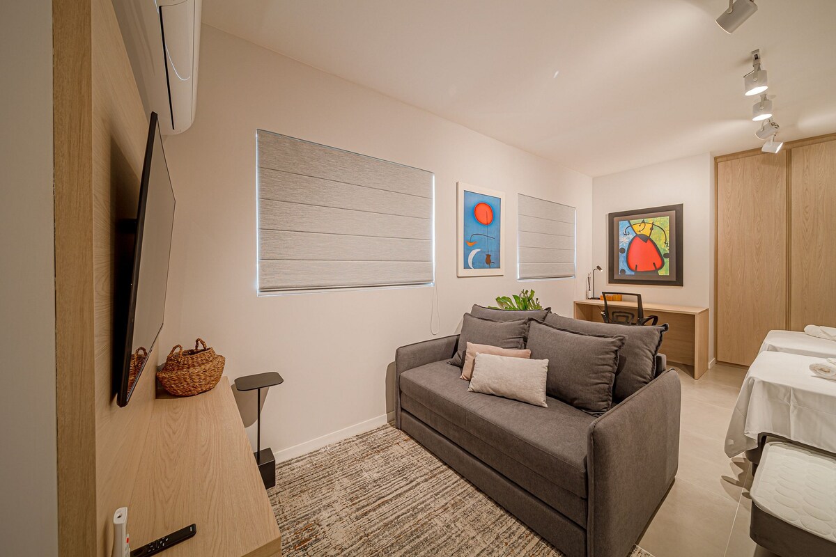 ¡Elegante estudio temático tipo Suf Lifestyle! Súper refinado, cómodo y lujoso, ideal para personas con estilo que buscan comodidad y practicidad. Cama Queen línea Benvenutti, supercómoda. Smart TV de 43" con streaming. Wifi potente. Cocina completa equipada con ollas y utensilios Tramontina, platos Porto Brasil, vasos y copas de vino. Cafetera y licuadora. Proporcionamos café en polvo, azúcar y sal, así como jabones y champú. También se proporcionarán materiales de limpieza.