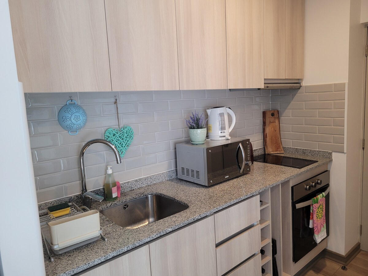 Departamento NUEVO céntrico, cómodo y acogedor a dos cuadras de la Plaza de Armas de Temuco, contiene: - TV - área de trabajo con escritorio - Wifi - lavadora+secadora - implementos de cocina, tostadora, mini pimer, licuadora, secador de pelo y sofá cama plaza 1/2, las habitaciones cuentan con TV.
