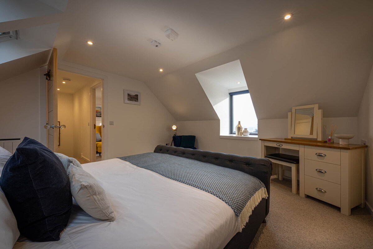 Gael es una cabaña moderna en un croft de trabajo, que captura vistas ininterrumpidas sobre la bahía de Portree, Ben Tianavaig y las colinas de Cuillin a lo lejos. La cabaña en sí tiene un atrio de altura completa que incluye una cocina funcional, una zona de estar, un quemador de leña y una suite de baño de tres piezas. Al entresuelo se accede mediante una escalera de madera con una cómoda cama doble. Situado justo al lado del sendero Scorrybreach, esta es la plataforma de lanzamiento perfecta para tu aventura en Skye.