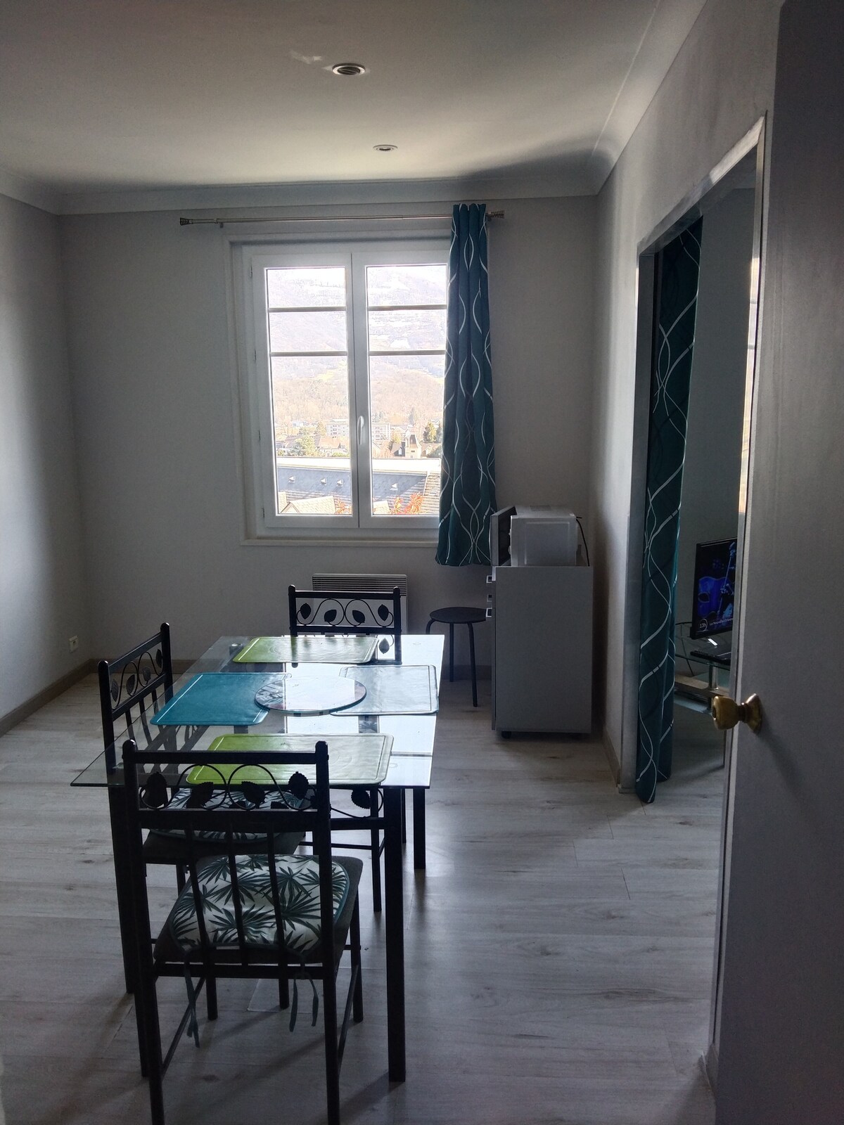 Estudio amueblado para 2 personas o 3 para un niño, posibilidad de añadir una cuna para un bebé más. En el segundo y último piso, totalmente renovado, situado en pleno centro de la ciudad (a 50 m del ayuntamiento). Muy agradable y luminoso con vistas a las montañas , con un pequeño jardín comunitario y una barbacoa. Ideal para veraneantes y curistas . Sala de estar con sofá cama (140 cm) , TV, cocina equipada, baño con bañera y plaza de aparcamiento privada.