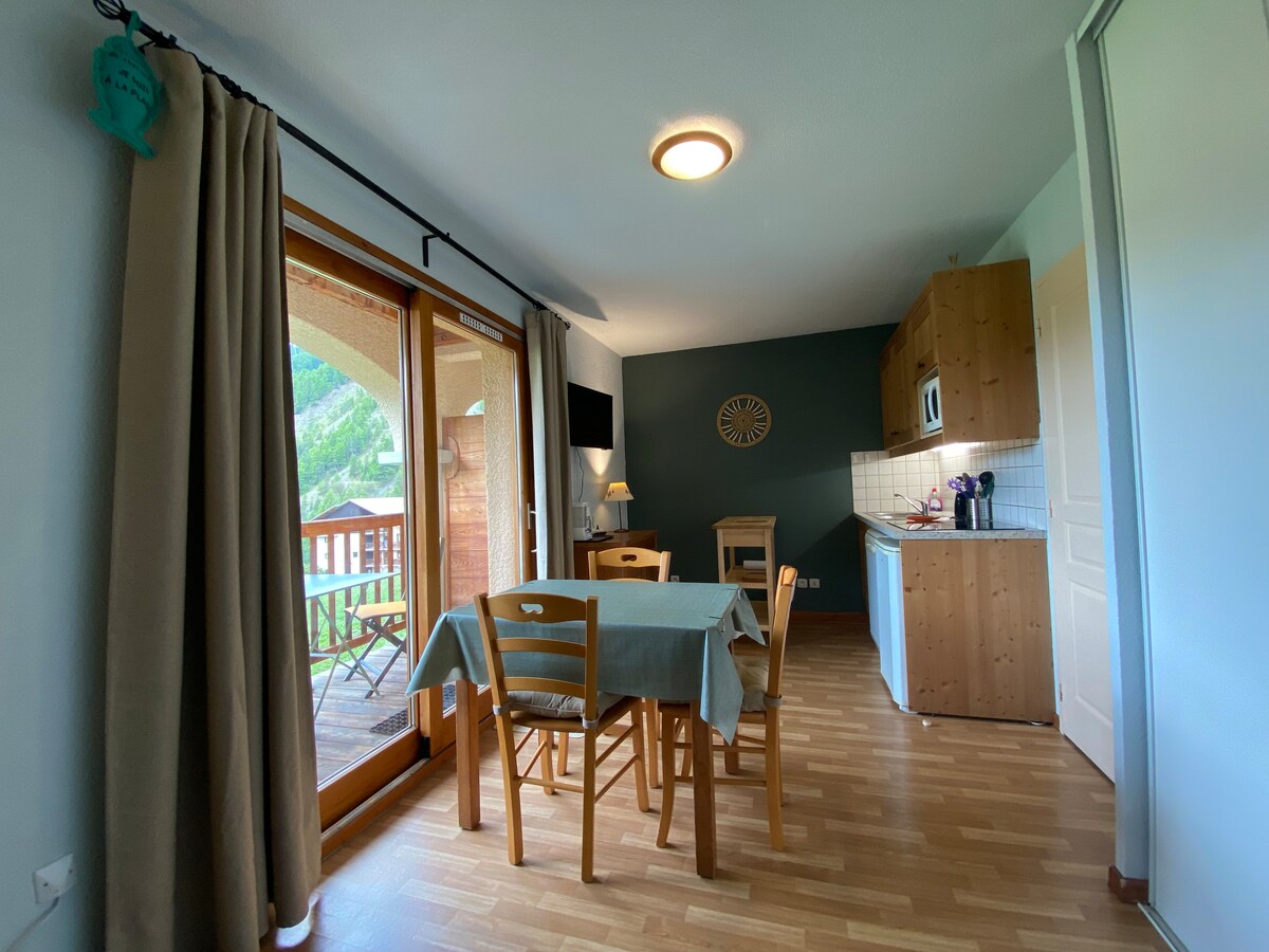 Bonito T1 con balcón orientado al sur y vistas a las montañas y al valle. Totalmente equipado, cocina y sala de estar con sofá cama nuevo (140), dormitorio con armario grande y cama de 160, baño con bañera, WC, aparcamiento. La residencia, equipada con una piscina al aire libre climatizada, se encuentra al pie de las pistas de esquí y rutas de senderismo, a 300 metros del pueblo. Arvieux es una estación de invierno y verano familiar y auténtica en el corazón del Parque Natural Regional de Queyras.