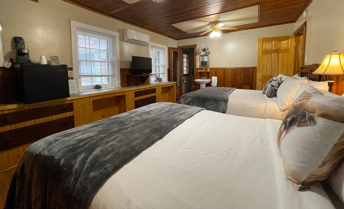 Esta habitación con dos camas tamaño queen para no fumadores tiene capacidad para 4 personas. Esta habitación incluye internet inalámbrico de alta velocidad, control remoto, televisión por cable, nevera, aire acondicionado, alarma de humo, artículos de tocador, bañera y ducha. Esta habitación cuenta con una cómoda de azulejos y madera personalizados.