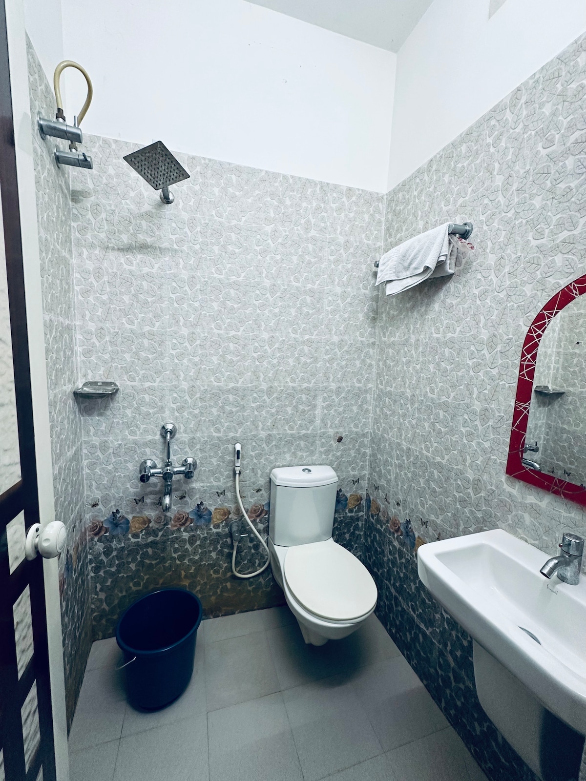 La casa tiene dos habitaciones dobles con aire acondicionado y baños adjuntos; una con calentador de agua y un baño común. Colchón doble adicional disponible en una habitación con cama. El espacioso pasillo tiene una mesa de comedor con 6 sillas, sofá y un diwan. La cocina con área de trabajo tiene nevera, purificador de agua, instalaciones de cocina, etc. El pasillo que conduce a la habitación Pooja y un patio al lado de un patio central son ideales para relajarse. Todos están bien ventilados con mosquiteros y para uso exclusivo de los huéspedes.