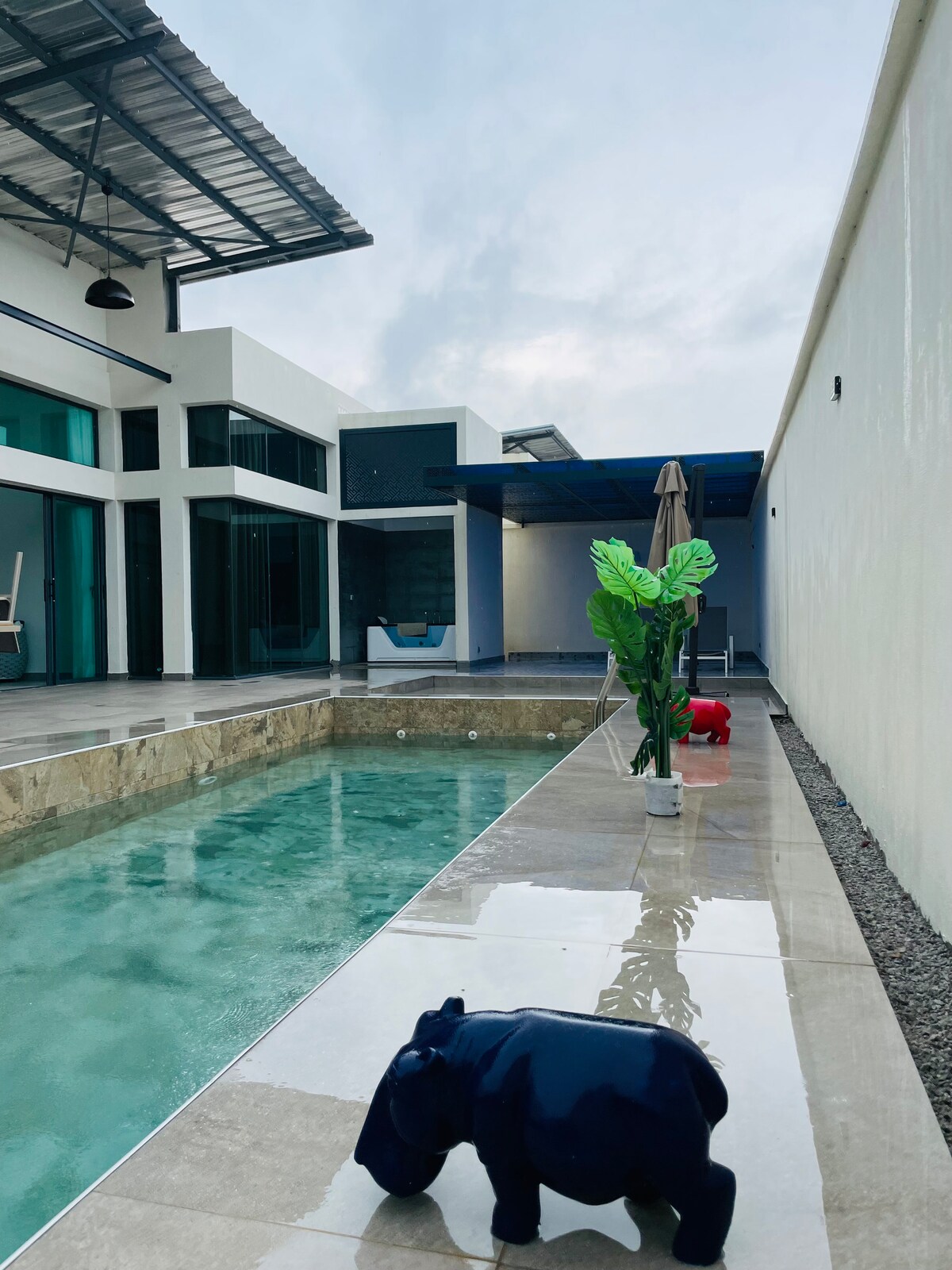 Vuelve a casa, relájate y disfruta de una nueva casa moderna con grandes ventanales y terrazas, piscina privada, jardín, zona de petanca, terraza y aparcamiento. La arquitectura moderna del edificio destaca por ser única. El interior te hace sentir como en casa, con una combinación de muebles locales modernos y tradicionales. El desayuno está incluido. También se pueden proporcionar bebidas, almuerzo o cena a petición. Wifi gratuito y TV vía satélite. La terraza con bar ofrece una vista exclusiva del bosque de la laguna.